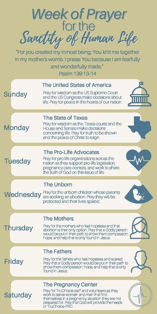 January 14 – January 20 is PRAYER WEEK leading up to Sanctity of Human Life Sunday, January 21, 2024. This is a week of meditation, reflection, calling out to our Heavenly Father, and creating awareness about not only the Sanctity of Human Life, but of resources that are available to help women and men of all ages that find themselves with an unplanned or unexpected pregnancy. We believe every life is precious and valuable and made in the image of God. Here is a Prayer Guide for the Week of Prayer 2024. We humbly ask you to join us in prayer.